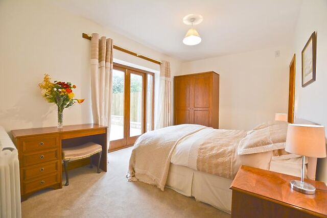 Kitchen with electric oven and hob, microwave, fridge/freezer, dishwasher, washing machine and dining table. French doors out to patio area and enclosed garden.