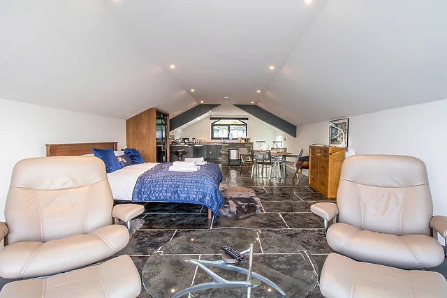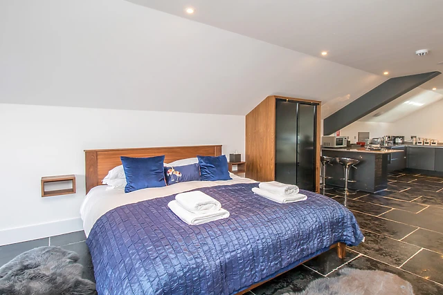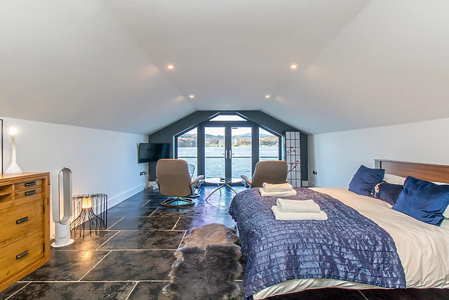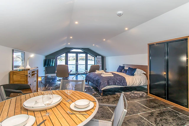 Accommodating two guests, this first-floor studio layout boasts a super king-size bed, ensuring restful slumber. The open-plan living space, complete with a modern kitchen, dining area, and sitting area, opens onto a balcony with awe-inspiring lake views.