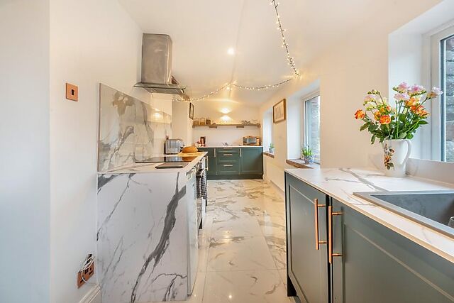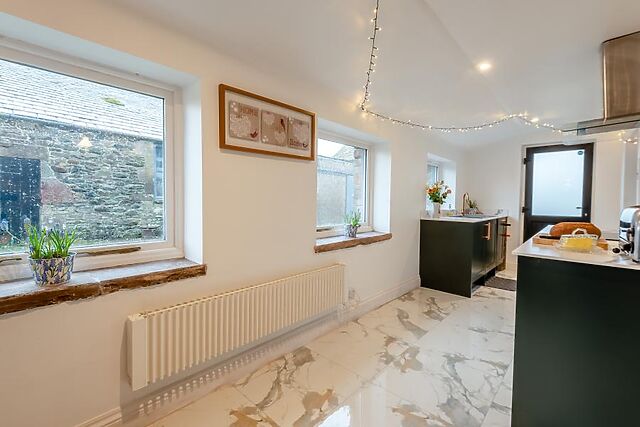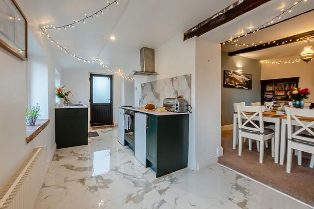 Inside, you'll find a spacious lounge designed for relaxation, complete with a cosy wood burner, Smart TV, and even a projector for group movie nights. The sleek and stylish kitchen is fully equipped for all your culinary creations, seamlessly flowing into the dining area where you can gather for memorable meals.