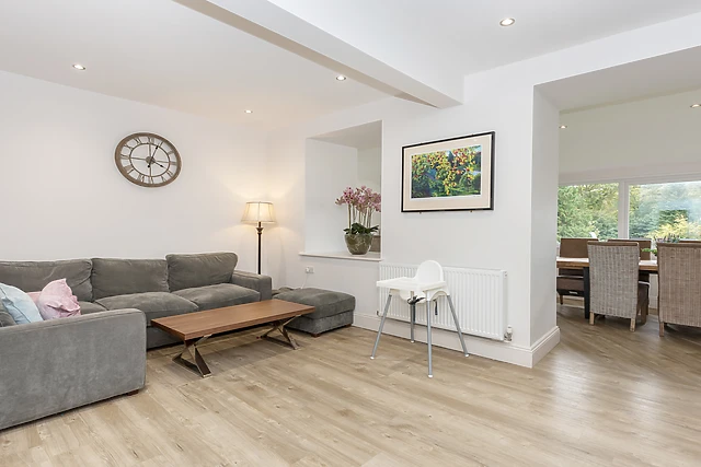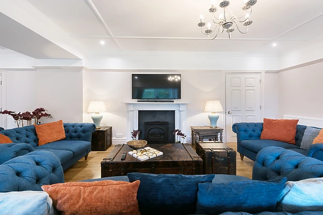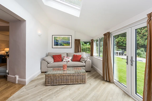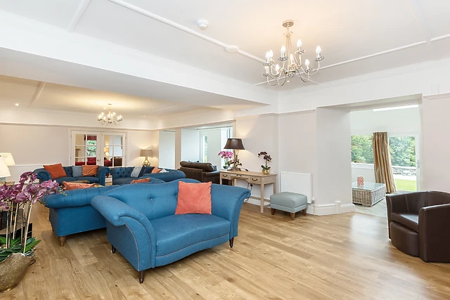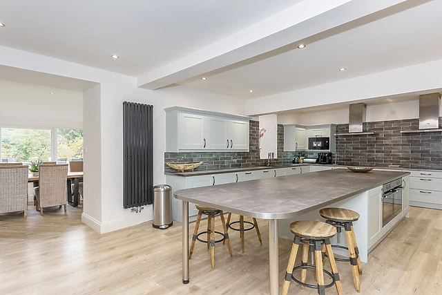 Featuring a main living room with cosy seating areas, a stylish drawing room with comfortable window seats, a warm wood-burning stove and the clever use of connecting doors that offer flexibility to use both rooms together. The spacious dining room overlooks a flat lawned area with captivating views out across the grounds and rolling hills to the south, with direct links through to the magnificent kitchen.