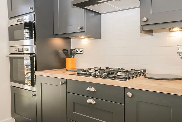 Make your way inside your beautiful new home, passing through the well-presented utility area that houses the washing machine and tumble dryer, before entering the open-plan living space. Enjoy making your favourite dishes within the exquisite, fully-equipped kitchen with neutral, dark units and fresh timber worktops, home to quality appliances including a gas hob and electric oven, along with two fridges, both with their own iceboxes.