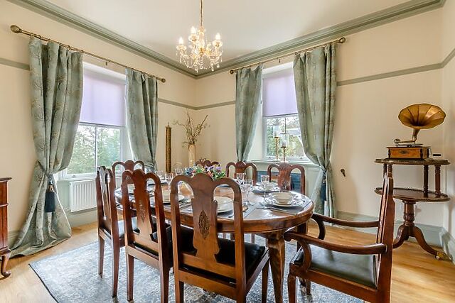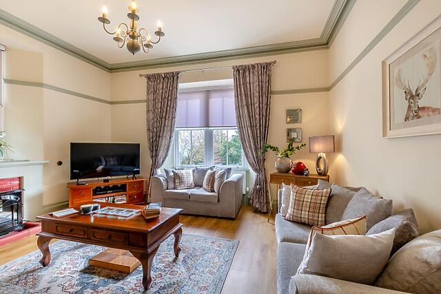 The dining room, adorned with beautiful antique pieces, provides a sophisticated setting for memorable meals, while the spacious living room invites you to unwind on plush seating, bask in natural light from large windows, and enjoy a cosy evening in front of the Smart TV. The bedrooms are beautifully furnished with stylish decor and luxurious fabrics.