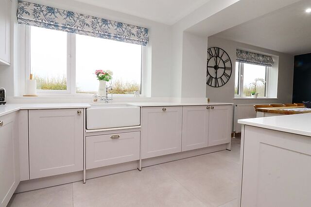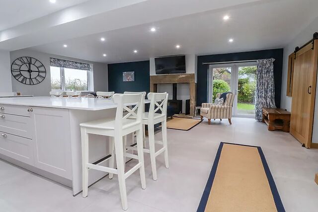 Inside, the open-plan living space is both inviting and thoughtfully designed. The kitchen is a standout feature, with sleek white cabinetry, a central island and breakfast bar seating, all bathed in natural light from the window above the sink, which offers a tranquil view of surrounding greenery.