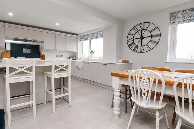 Budding chefs will find everything they need to prepare hearty meals, from the induction hob and oven to the microwave, fridge, freezer and dishwasher. The dining area is neatly laid and positioned beside a large window, where guests can enjoy meals with a view of rolling fields beyond.