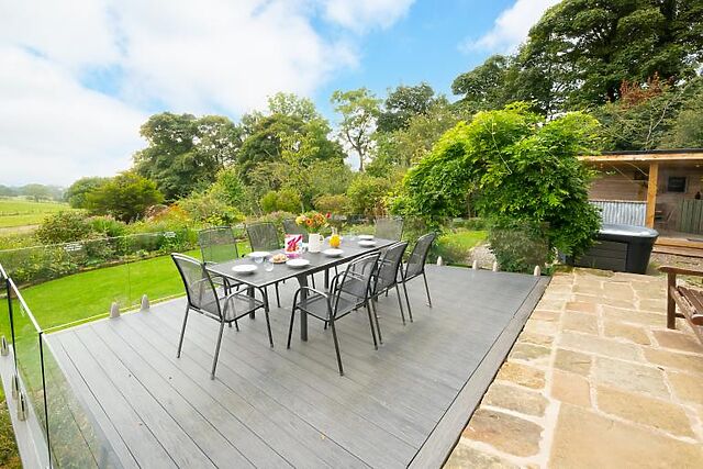 Step outside to the stone patio and raised terrace deck, where you can soak in the panoramic views of the Ribble Valley. The outdoor area is perfect for dining al fresco, with a large table and chairs provided.