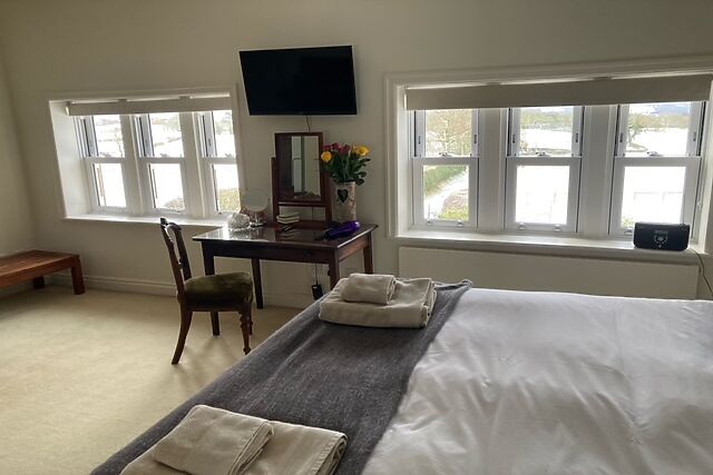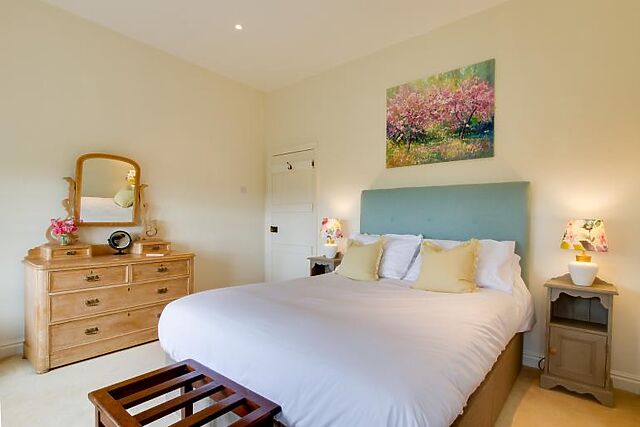 Relax in the airy, wood-beamed lounge, complete with a cosy woodburner and a 55” Smart TV. The large kitchen-dining room, equipped with a Range Cooker and modern amenities, provides ample space for preparing and enjoying meals together. The farmhouse's décor blends modern and traditional styles, creating a warm and inviting atmosphere.