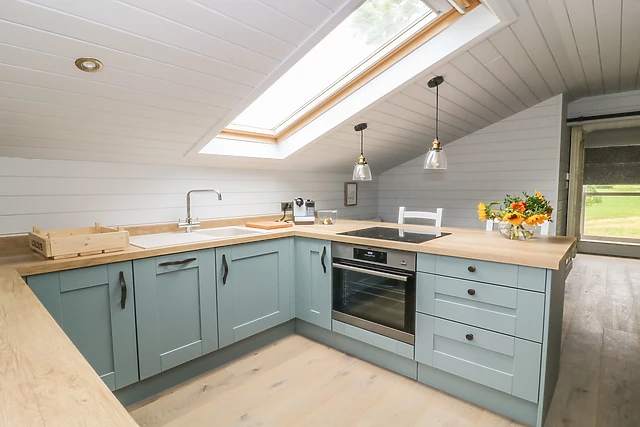 The kitchen to your left is well-presented with pastel blue base units, white wall panelling and Velux windows. This sleek design comes together nicely with a breakfast bar and a lovely sitting area positioned adjacent.