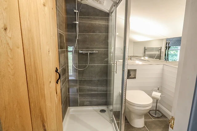 Curl up with your loved one and watch a film together on the Smart TV or simply enjoy each others' company amongst the lavish set-up surrounding you. Through a solid oak door is the double bedroom positioned at the rear of the cottage, beautifully laid out with a stylish en-suite shower room to accompany, a fabulous place to get ready with mirrored walls and sleek, slate grey tiling around the shower.