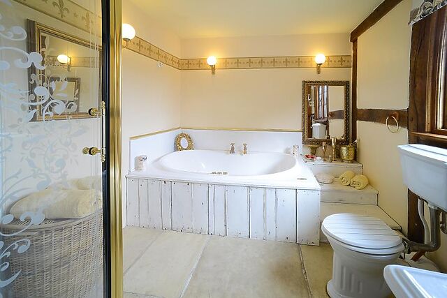 On arrival, step into the entrance hallway to find a ground-floor king bedroom with an en-suite shower room and separate toilet, followed by three further bedrooms: a super-king zip-and-link with a slipper-bath en-suite, a super-king with an indulgent four-poster bed and an en-suite with shower and Jacuzzi-style bath, and a twin with its own en-suite shower room. The showstopping lounge is a real treat, with vaulted ceilings, beautiful beams, stained glass, a feature fireplace, a Smart TV for relaxed evenings, and plenty of comfy seating for 12.