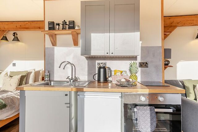 Exposed timbers and a soothing neutral colour palette not only set a peaceful ambience but also reflect the idyllic atmosphere of the surroundings. Sleek and stylish, the central kitchenette provides everything you need to rustle up something delicious, whilst the sumptuous corner sofa at one end of the lodge can be converted to cater for an additional two children.