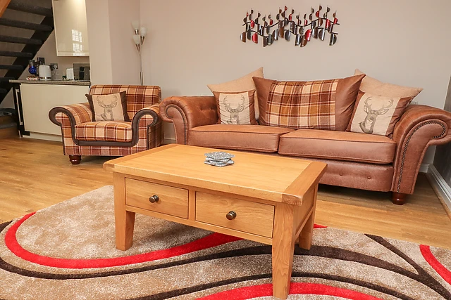 Inside, you'll find a cosy open-plan living space that exudes a contemporary country vibe, complete with a sleek kitchen, dining area, and stylish sitting space. The family bedroom upstairs features a king-size and a single bed, ensuring a restful night's sleep for all.
