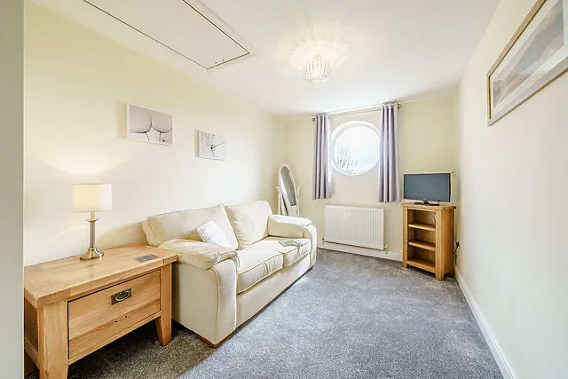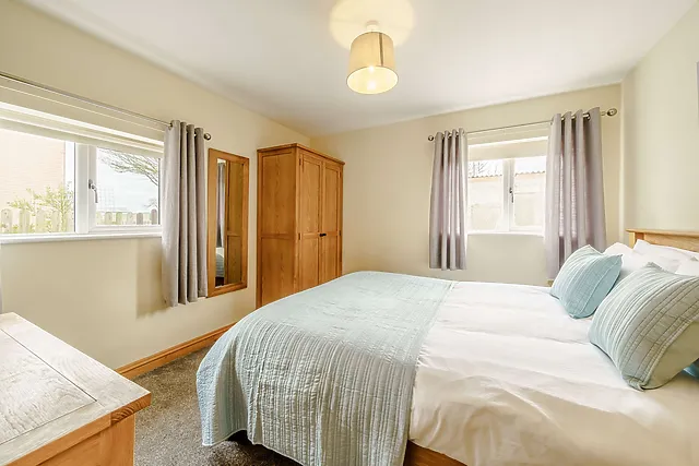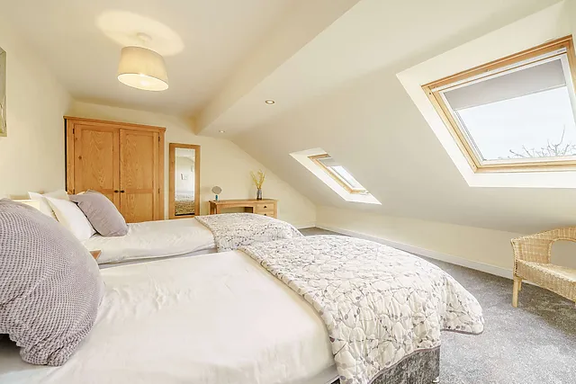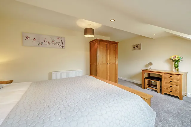 The cottage offers three bedrooms, providing comfortable sleeping arrangements for up to six guests. There is one king-size bedroom on the ground floor and two additional bedrooms upstairs, one king-size and one twin zip and link.