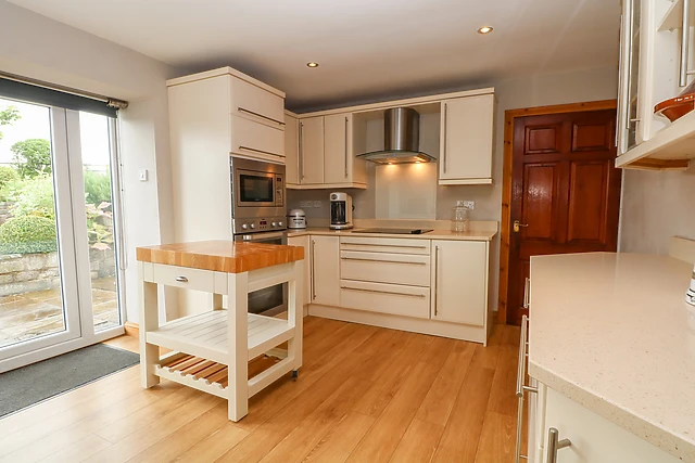 The heart of this home is its inviting kitchen, leading to a spacious sitting and dining area adorned with a woodburning stove for cosy evenings.