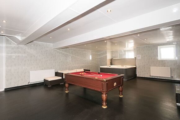 The ground floor has two living rooms a sun room and a dining table seating 18. A games room with pool table sits on the lower ground floor.