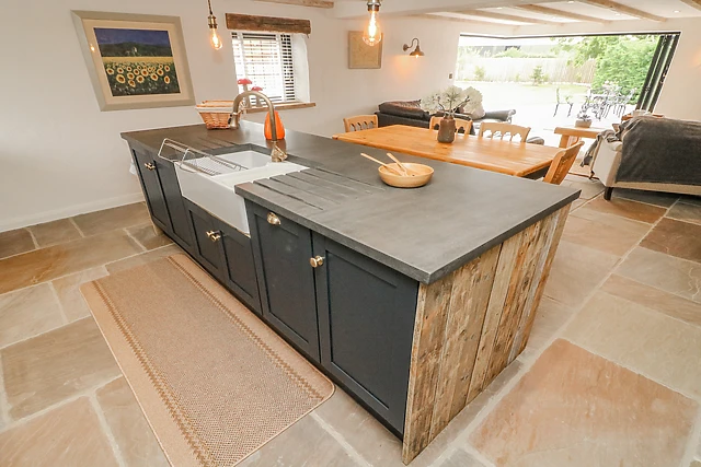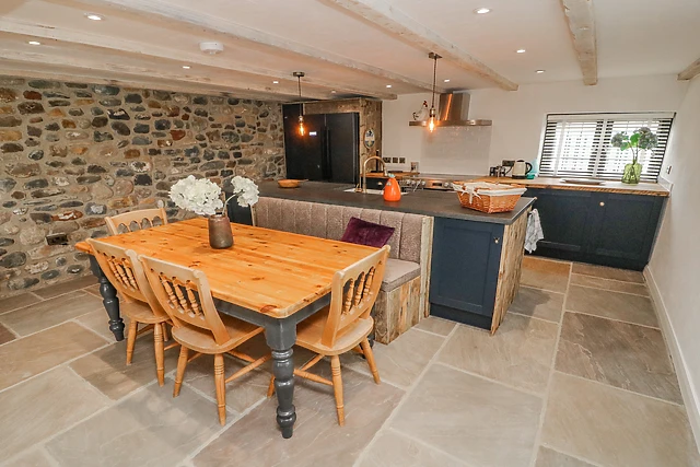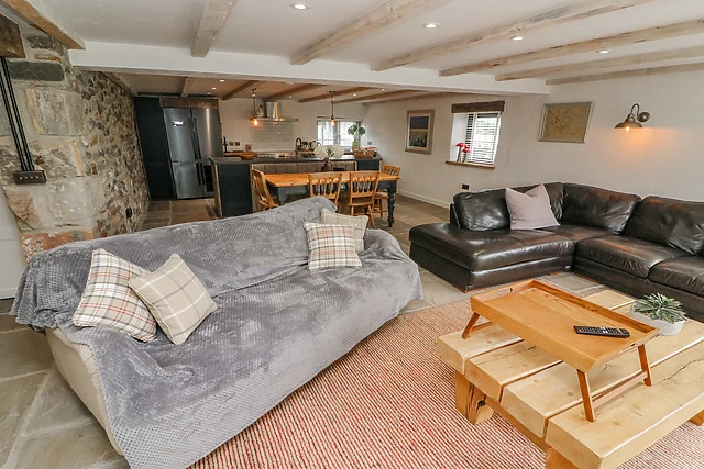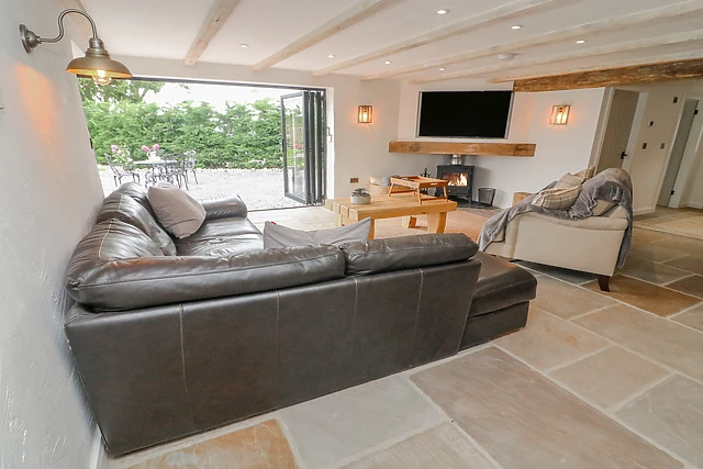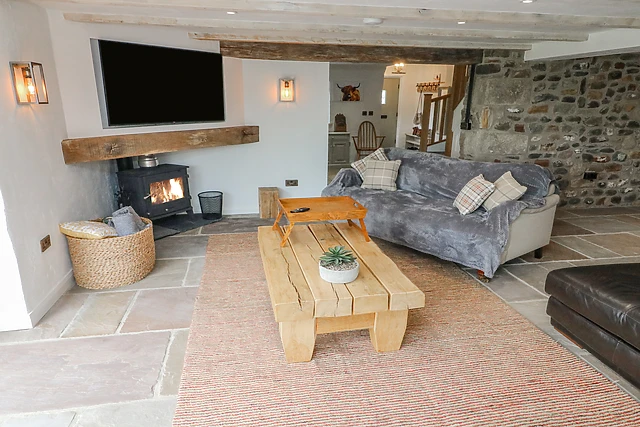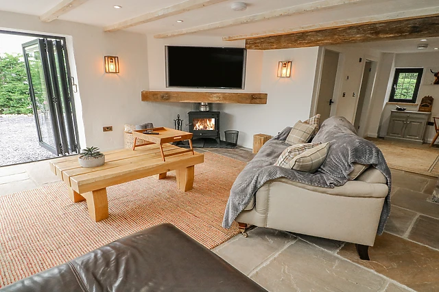 Indulge in the open-plan living space, where a woodburning stove adds a cosy touch.