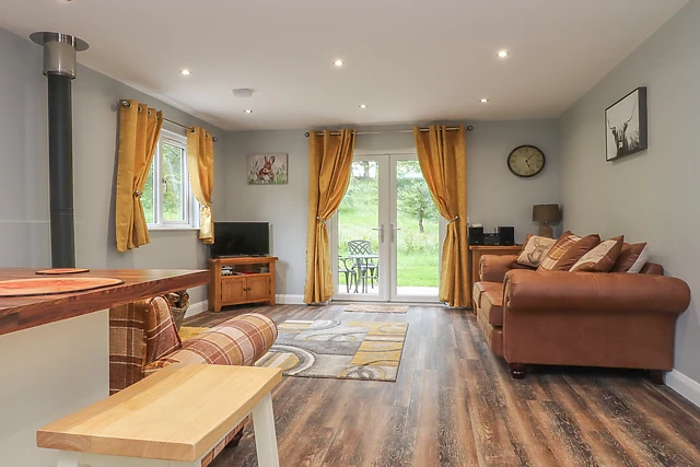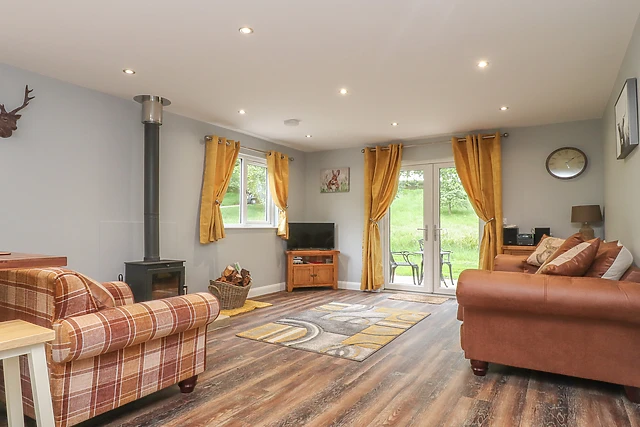 The open-plan living space, complete with a woodburning stove, offers a cosy atmosphere for intimate evenings in.