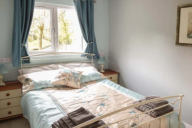 Tucked away from the main road, the chalet is accessed by a wooden bridge onto a decked veranda that wraps around the front of the property. Here, you can sit outside and dine alfresco, then relax with a glass of wine in the hot tub!