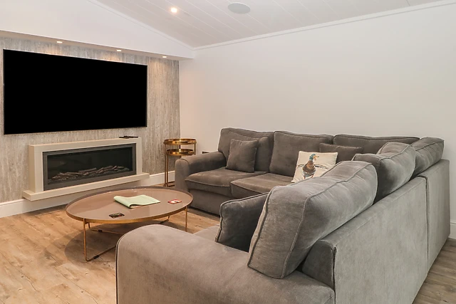 The open-plan living space, complete with a chic kitchen and cosy sitting area with an electric fire, is perfect for family gatherings.