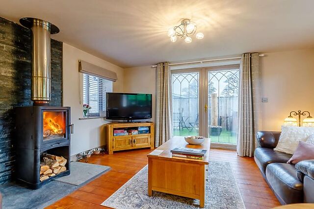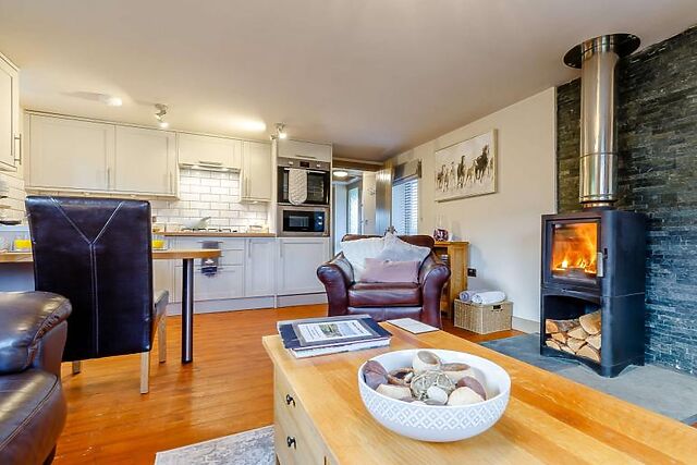 The lounge is equipped with a Smart TV and a wood burner, perfect for snuggling up on cooler evenings, while the kitchen is fitted with modern amenities, including a Nespresso coffee machine.