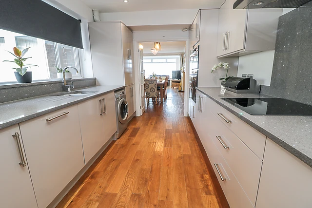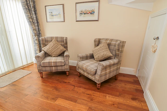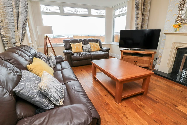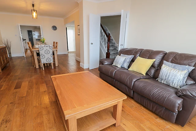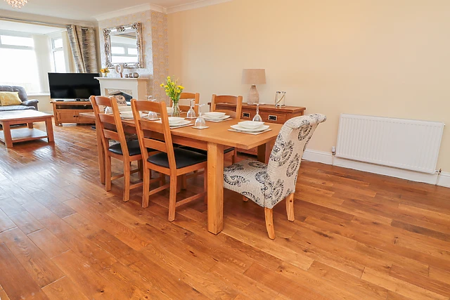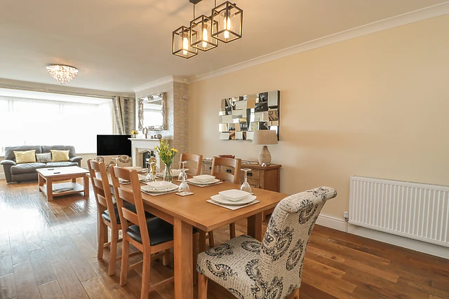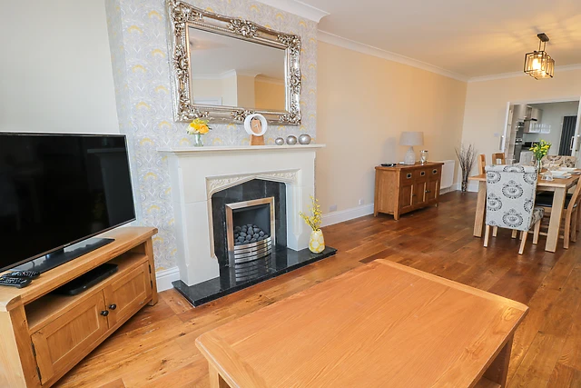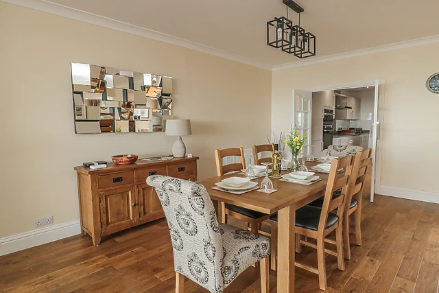 After taking in the breath-taking coastal views and catching a glimpse of the town’s famous Couple Statue, be welcomed into the spacious sitting/dining room, where you can look forward to spending relaxing evenings in with your loved ones. Choose to curl up in front of the gas fire and select your favourite film on the TV with Sky Q or enjoy panoramic views of the sea, or gather your loved ones around the formal dining table to share your holiday stories over a well-deserved bottle of wine.