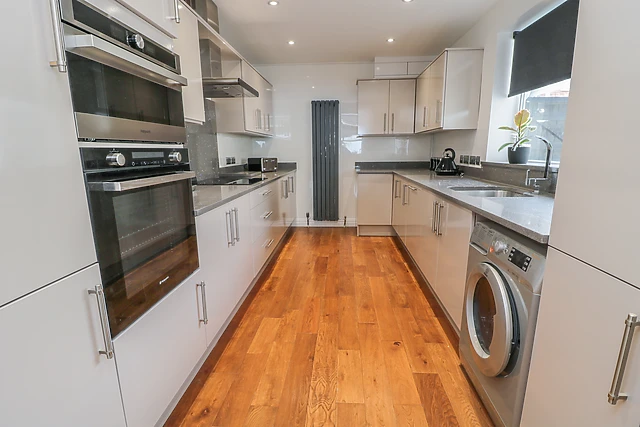 Beyond here is the contemporary kitchen which houses all the essentials to cater for yourself during a week-long stay, including a washing machine and a dishwasher for your convenience. As the evening draws to a close, venture up the staircase to find three bedrooms, comprising two double bedrooms and a single bedroom.