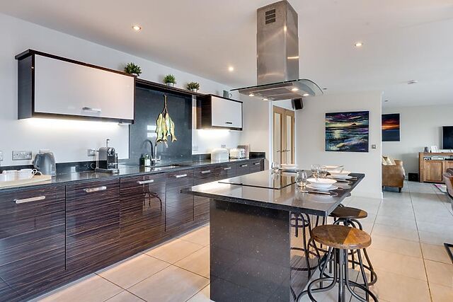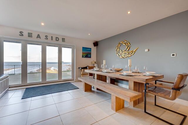 - Superb location just steps from Beadnell's Smuggler's Cove beach and in walking distance of Beadnell Beach - A top-end architectural design with extensive use of glass maximising light and views - Breathtaking uninterrupted sea views from ground and first floor - Large terrace with outdoor furniture, hammock, BBQ, toys and steps to beach (quite steep, but there is another more gentle access to the beach nearby) - Open plan kitchen/dining area with wine cooler, food processor and Dolce Gusto coffee machine - Large TV in downstairs living area, Sky Q system and surround sound - Sofa bed in upstairs master bedroom can be requested for an additional adult or up to two children - Parking on driveway for three/four cars - Private leisure club membership (entry fee applies) Ground Floor - Spacious entrance hallway - Large open plan living, dining, kitchen area opening out onto a terrace, with sea views - Fully fitted contemporary kitchen with island cooking station all in lacquered macassar ebony finish and bar stools round the island unit - Bedroom 1 with flexible super king or twin beds (will be 'as found' unless requested on booking) and ensuite bathroom with separate shower accessed via the bedroom or the hallway - Utility room off kitchen with sink - Downstairs WC - Attached garage with useful storage space First floor - Master bedroom with king size bed and ensuite with bath and shower. Additional sofa bed in this room suitable for an adult or two children can be made up on request - Bedroom 3 with Super king or zip-and-link twin beds (will be 'as found' unless requested on booking) - Bedroom 4 with flexible super king or twin zip and link beds (please state at time of booking how you want this made up otherwise it is 'as found') and a single bed - Bedrooms 3 and 4 share a 'jack and jill' style shower room - Second living area with panoramic views overlooking the beach at Smugglers' Cove - First floor landing of almost cathedral-like proportions with glass correspondence station - an ideal study area if you really can't leave the office at home.