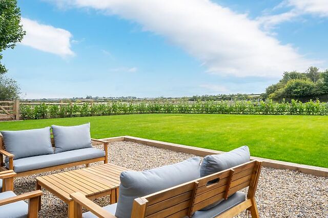 Outside, the south-facing garden offers a third of an acre of lawn and a gravelled, furnished patio.