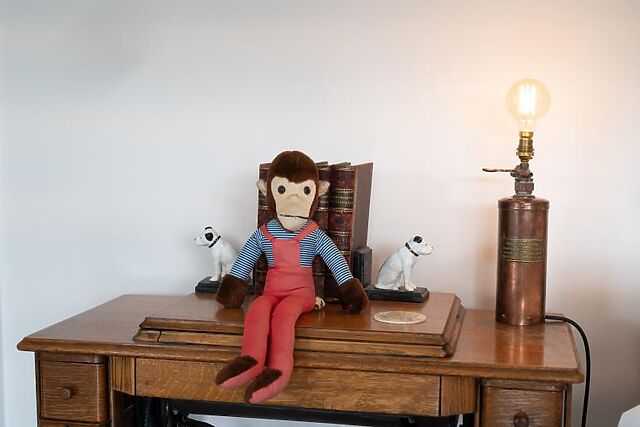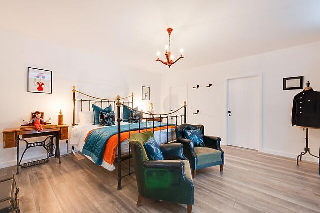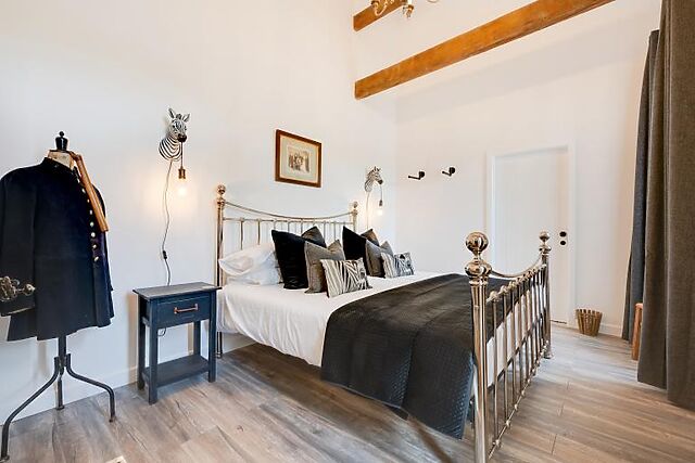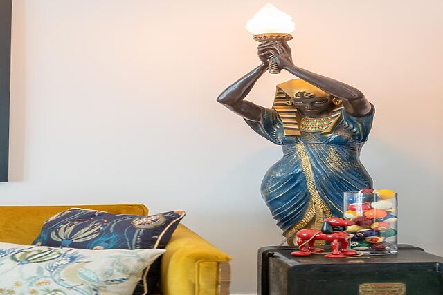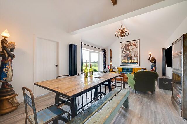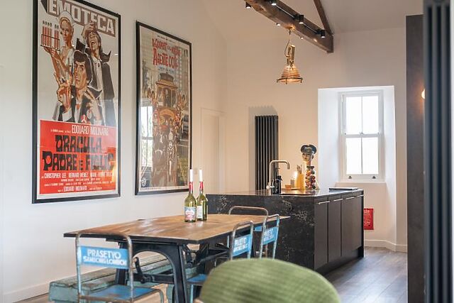 Step inside and admire the quirky decor and accessories throughout. The open-plan living area features a lounge with wall art, wooden floors, and charming seating. The kitchen is equipped with slick grey units, Silestone worktops, and a central island with stools. The dining area has a trendy six-seater table.