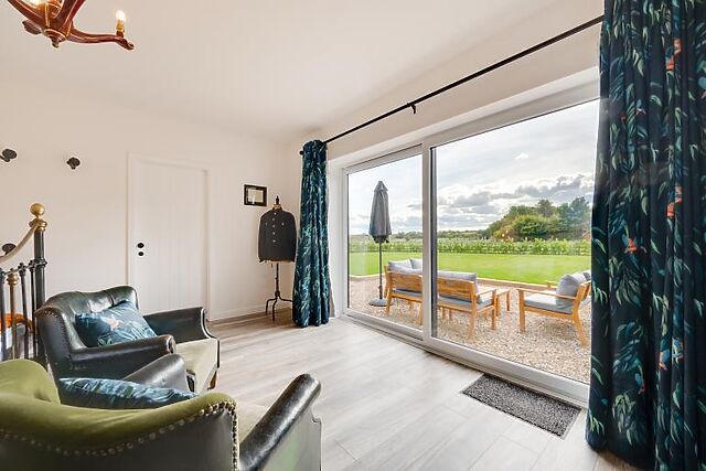 There is a wooded area with a child’s swing and a bench overlooking the fields. The detached garden room is set up as an outside bar with furniture, a dartboard, and more quirky accessories.