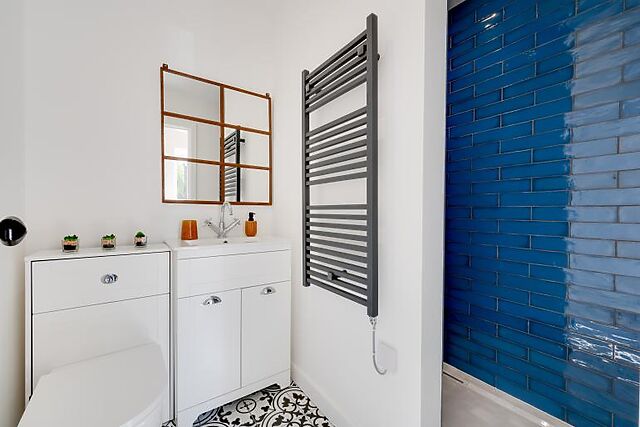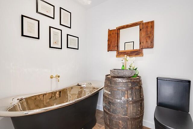 The first super-king-size bedroom has patio doors leading to the garden and a chic en-suite bathroom with a feature copper bathtub and separate shower. The second super-king-size bedroom also has an en-suite shower room, and the twin bedroom comes with its own en-suite shower room.
