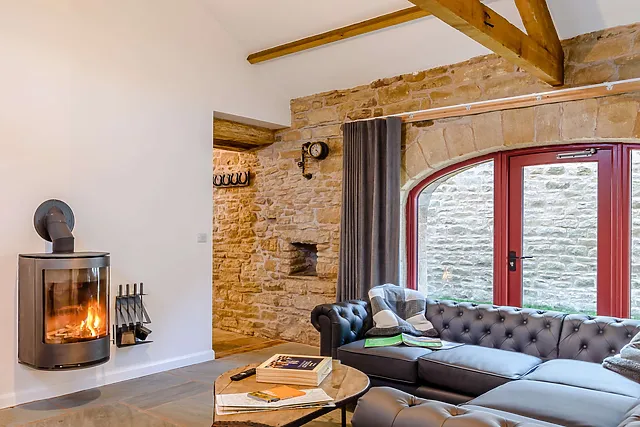 Original features such as leather bellows blend seamlessly with modern amenities, creating a unique and comfortable living space. The property is equipped with a full kitchen, a cosy lounge with a wood-burning stove, and a smart TV for those evenings spent indoors.