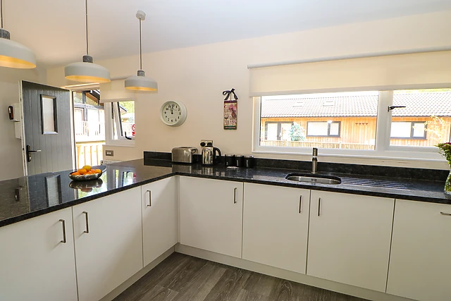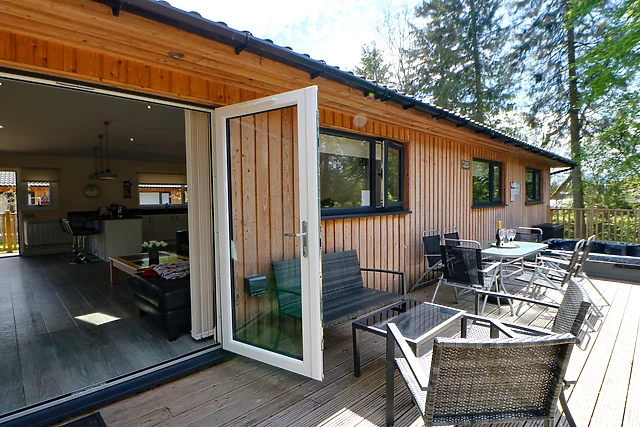 The lodge is well-equipped with modern amenities including a 65" Smart TV, high-speed WiFi, and a kitchen with an induction hob and dishwasher, ensuring a comfortable and convenient stay.