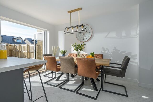 On arrival, step through the front door and leave your coats and shoes in the welcoming hallway. The kitchen is bright and west-facing, with French doors opening onto the garden, a breakfast bar for perching with coffee, and a dining table seating eight.
