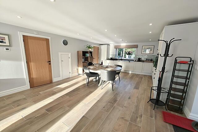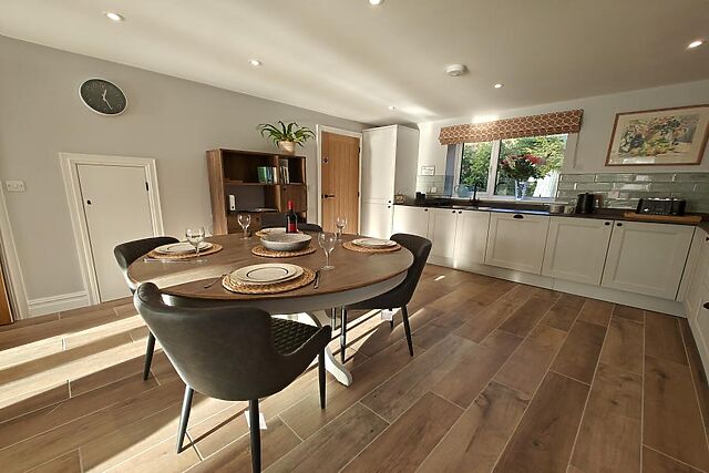 Step through the front door into the light-filled, open-plan living space, where underfloor heating throughout the ground floor adds year-round comfort. Expansive windows and French doors frame lovely garden views, while comfortable seating invites you to unwind after a day of exploring.