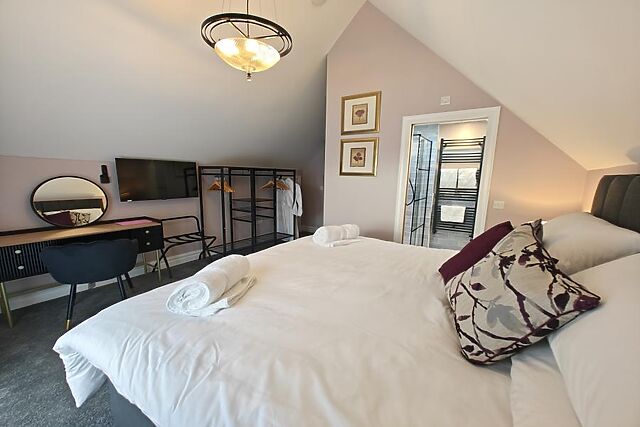 Both feature elegant en-suite walk-in showers and WCs, dressing tables, open hanging space and practical suitcase holders. Outside, the French doors open onto a private patio, creating a seamless indoor-outdoor living experience during the warmer months.