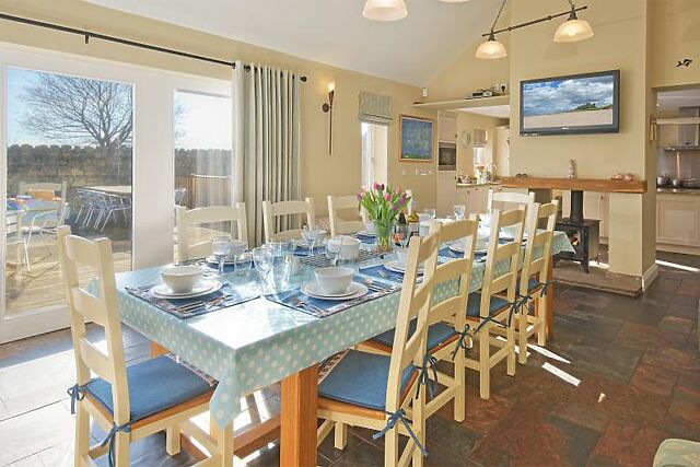 The house boasts an impressive open-plan kitchen and dining area, complete with a two-sided wood burner, a large kitchen island, and granite worktops. The dining area seats ten and includes a Smart TV and a comfortable sofa. French doors open onto a south-facing patio, perfect for alfresco dining.