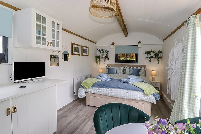 Accommodating up to two guests, this charming shepherd's hut offers a cosy and intimate setting. Complete with a sumptuous double bed, it provides a restful night's sleep under the stars. The accommodation is well-appointed with all the modern comforts you could desire.