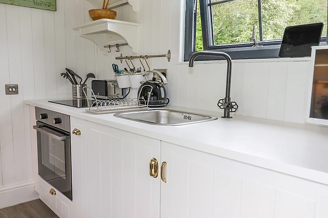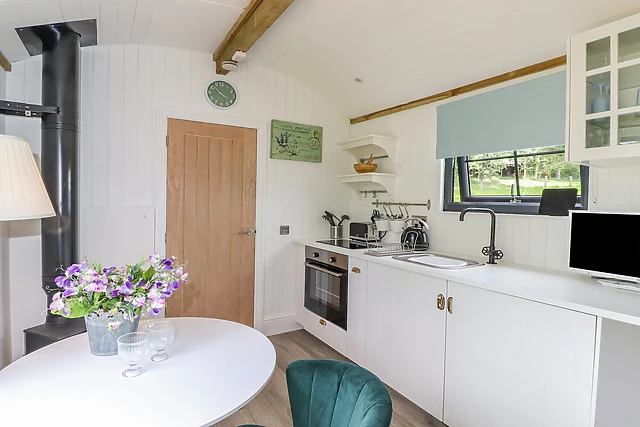 The shepherd's hut is equipped with a kitchenette, featuring essential cooking facilities for guests to prepare meals and enjoy a self-catering experience.