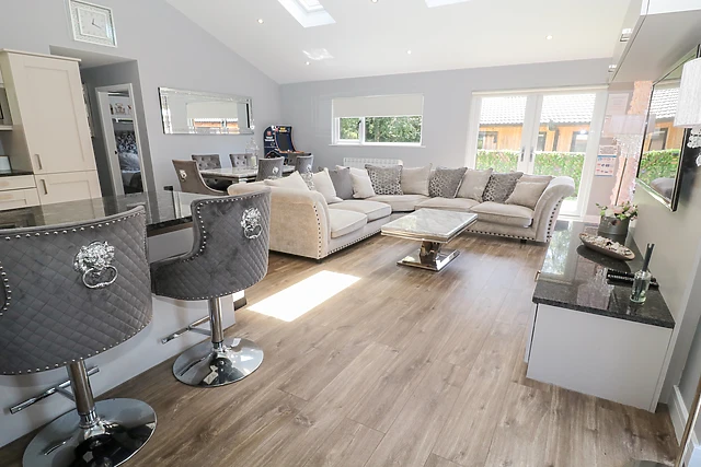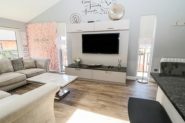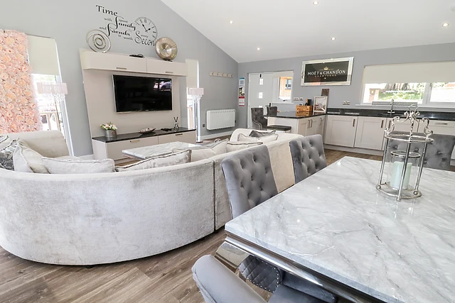 The lodge boasts a contemporary open-plan living space, complete with a Smart TV and a well-equipped kitchen for home-cooked meals.