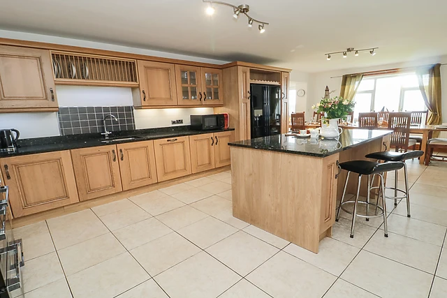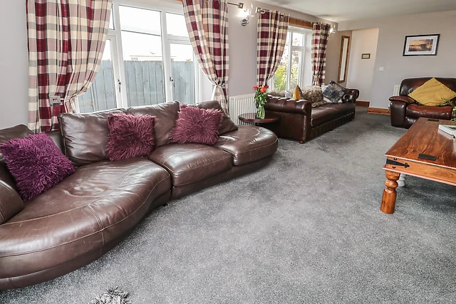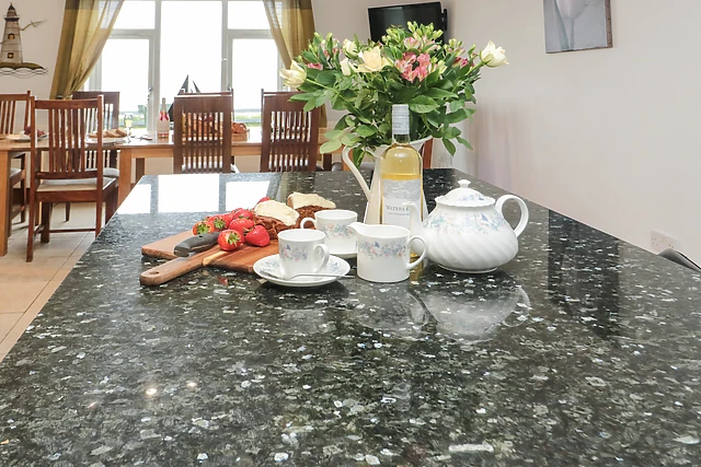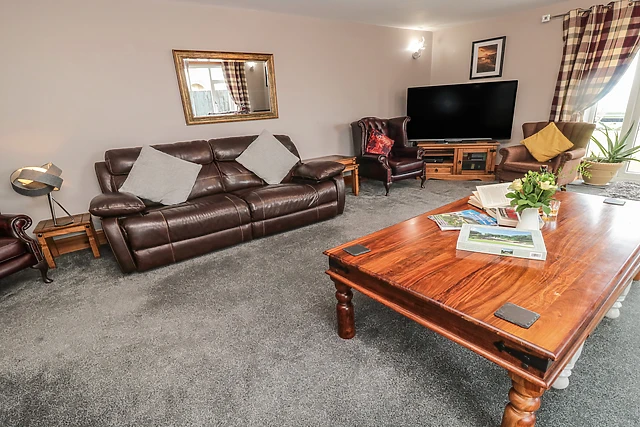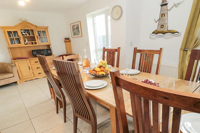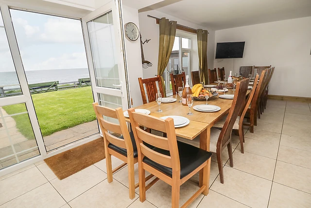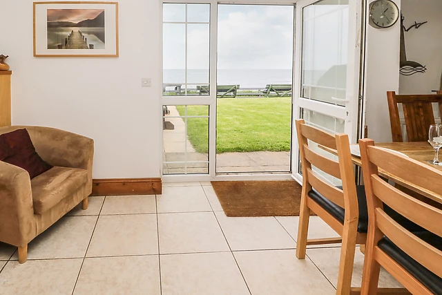 As you step inside, be greeted by a spacious and modestly-decorated sitting room, complete with TV and French doors with views out to the coast, perfect for unwinding after a day of exploration. Move into the fully-equipped kitchen which is a delight for any aspiring chef, with a range cooker and a multitude of other appliances perfect for preparing delicious meals.