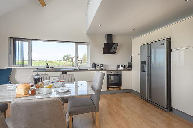 Climb the carpeted stairs up to the first floor to emerge in your magnificent, open-plan lounge/kitchen/diner. Very much the social hub of this holiday home, this stunning, vaulted space has a bank of windows with sliding glass doors, framing the incredible views.