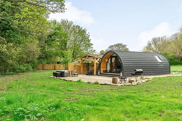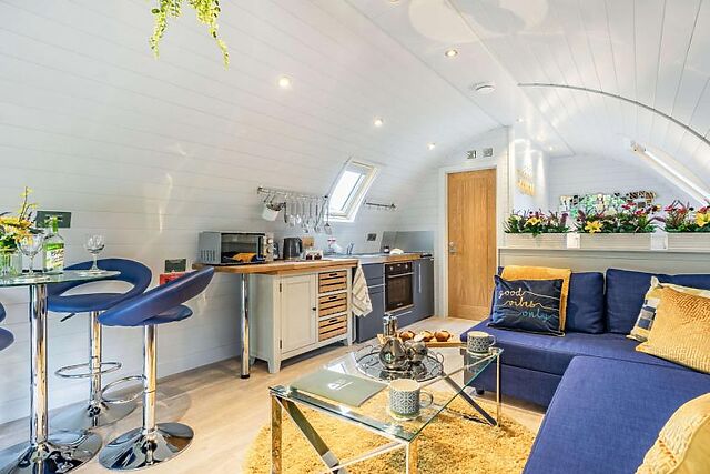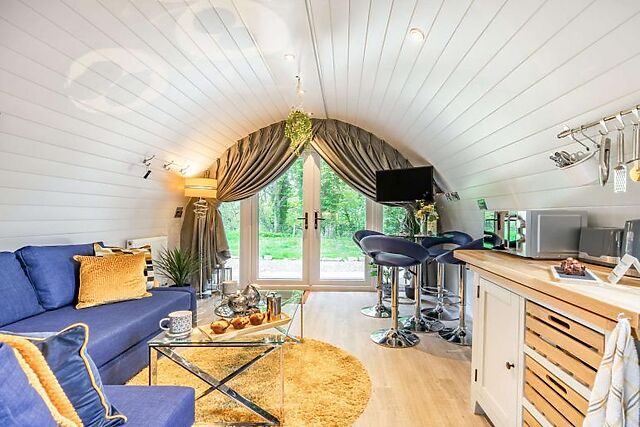 The pod sleeps 2 guests, with an additional sofa bed for extra convenience. Inside, you'll find a well-equipped kitchen, a cosy double bedroom, and a modern shower room. The large front windows flood the space with natural light, creating a seamless connection with the tranquil outdoors.