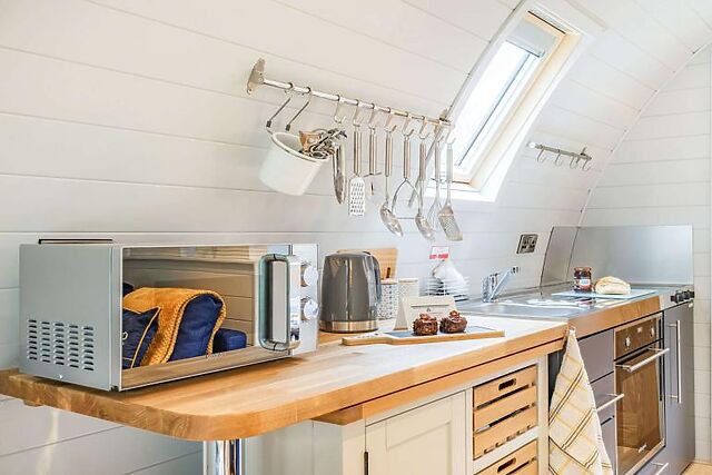 Inside, you'll find a well-equipped kitchen, a cosy double bedroom, and a modern shower room. The large front windows flood the space with natural light, creating a seamless connection with the tranquil outdoors.