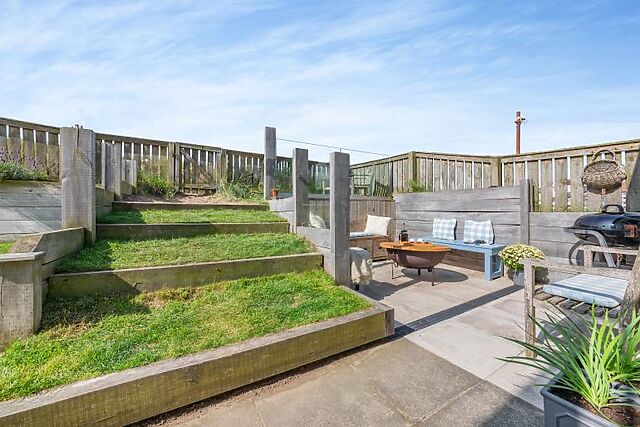 The enclosed garden is a highlight, with a patio area and comfortable outdoor furniture.