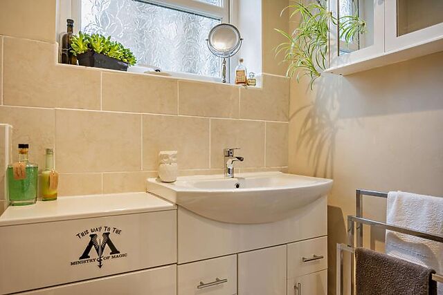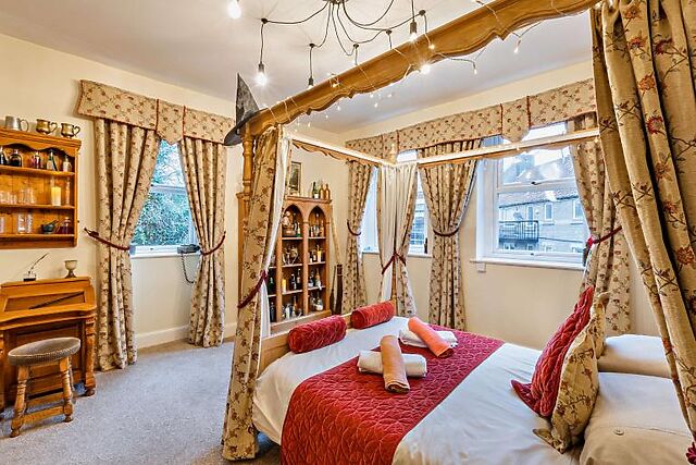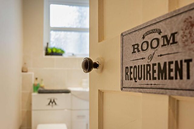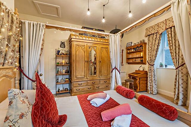 The bedroom, themed as a 'potions room', boasts a four-poster king-size bed adorned with twinkling lights and curious decorations. The shower room, whimsically named the 'room of requirement', offers a shower and WC.