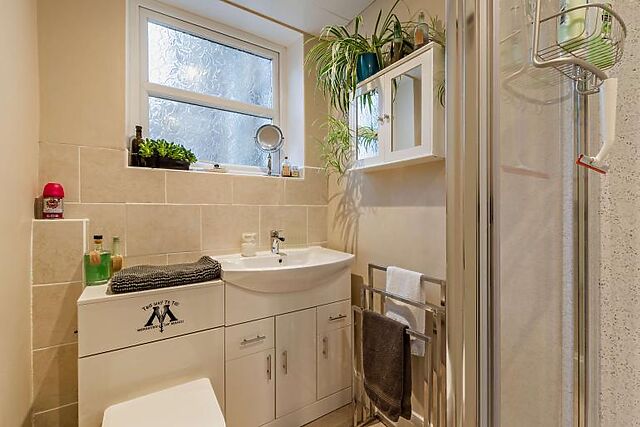 Outside, guests can enjoy a small, shared garden with furniture for al fresco dining.