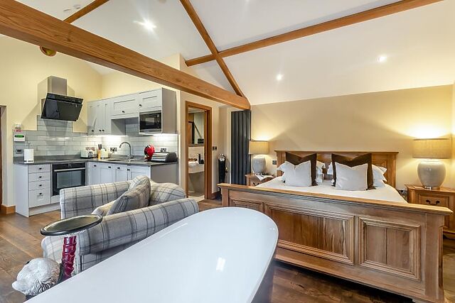 When stomachs begin to rumble, find that the sleek corner kitchen boasts everything needed to cook up holiday feasts, to be enjoyed at the cute dining table sitting in the light of the window. After dinner, enjoy a long soak in the stunning free-standing bath set in one corner, then retreat to your super-king-size bed for undistributed slumber.