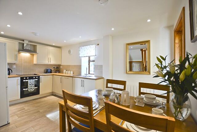 The kitchen/diner is bright and airy, thanks to French doors that open onto a gravel patio. The patio is furnished, making it ideal for alfresco dining in the peaceful garden setting.