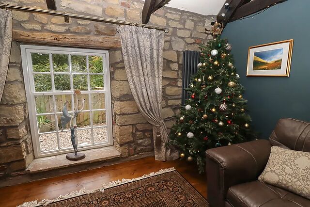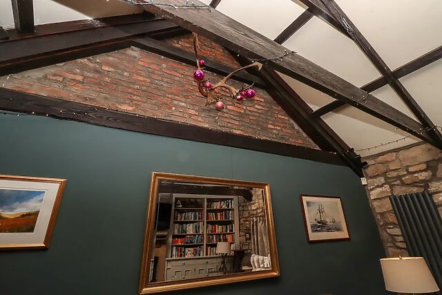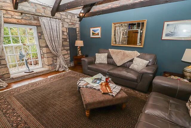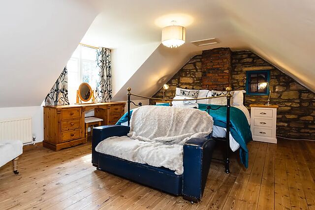 Adjacent to this, you will find an inviting sitting room, complete with a wealth of traditional features including exposed stonework, a vaulted ceiling, and original windows, along with a Smart TV and DVD player for your entertainment, as well as a warming woodburning stove for those chillier evenings. The ground floor also hosts a super-king-size bedroom, which can be made into twins on request, offering flexible sleeping arrangements to suit your group.