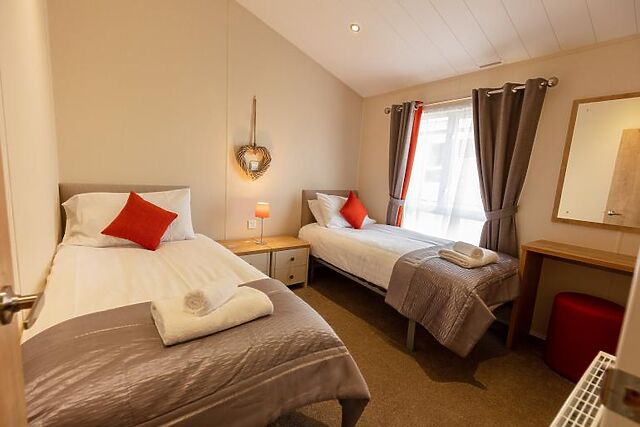 The cabin offers two comfortable bedrooms - a double with an en-suite shower room and a twin room - both served by a family bathroom with a shower over the bath. The entire space is designed to provide comfortable accommodation for families or friends after a day of exploration.